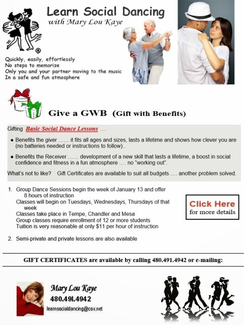 We’re looking for about 6 or more fun-loving people to join our group Basic Social Dance 101 class that is forming at Mesa Spirit RV Resort beginning Monday, November 18, 2013 at 3:30 p.m. in the activity hall. The address of the facility is 3020 East Main Street, Mesa 85213. This is a new program offered by Mesa Spirit and we’d like to get it off to a rousing start. We need a few more people so that the special low introductory rate for group classes can be put into effect ….. the minimum number of participants to qualify for a group rate is 12.